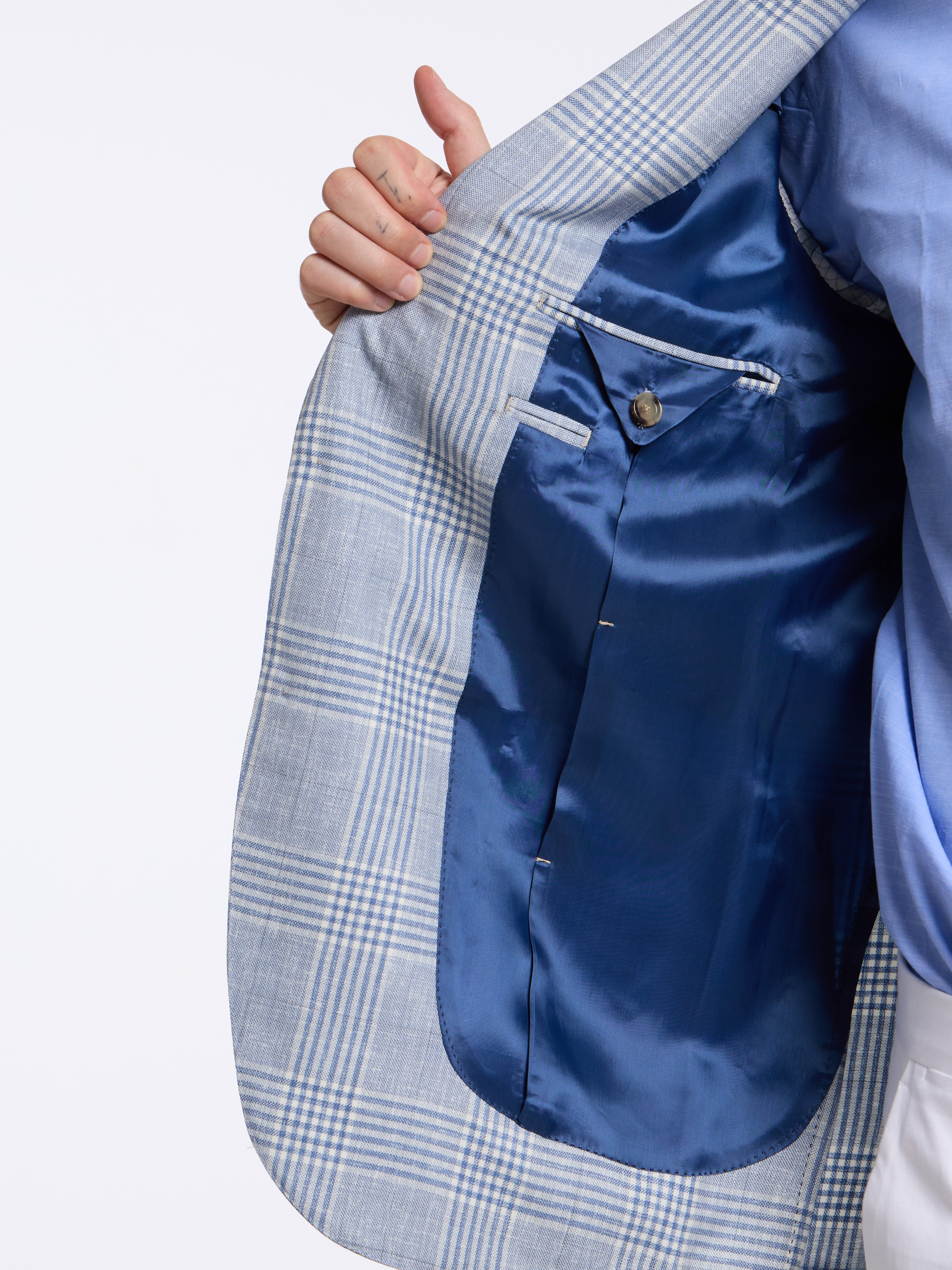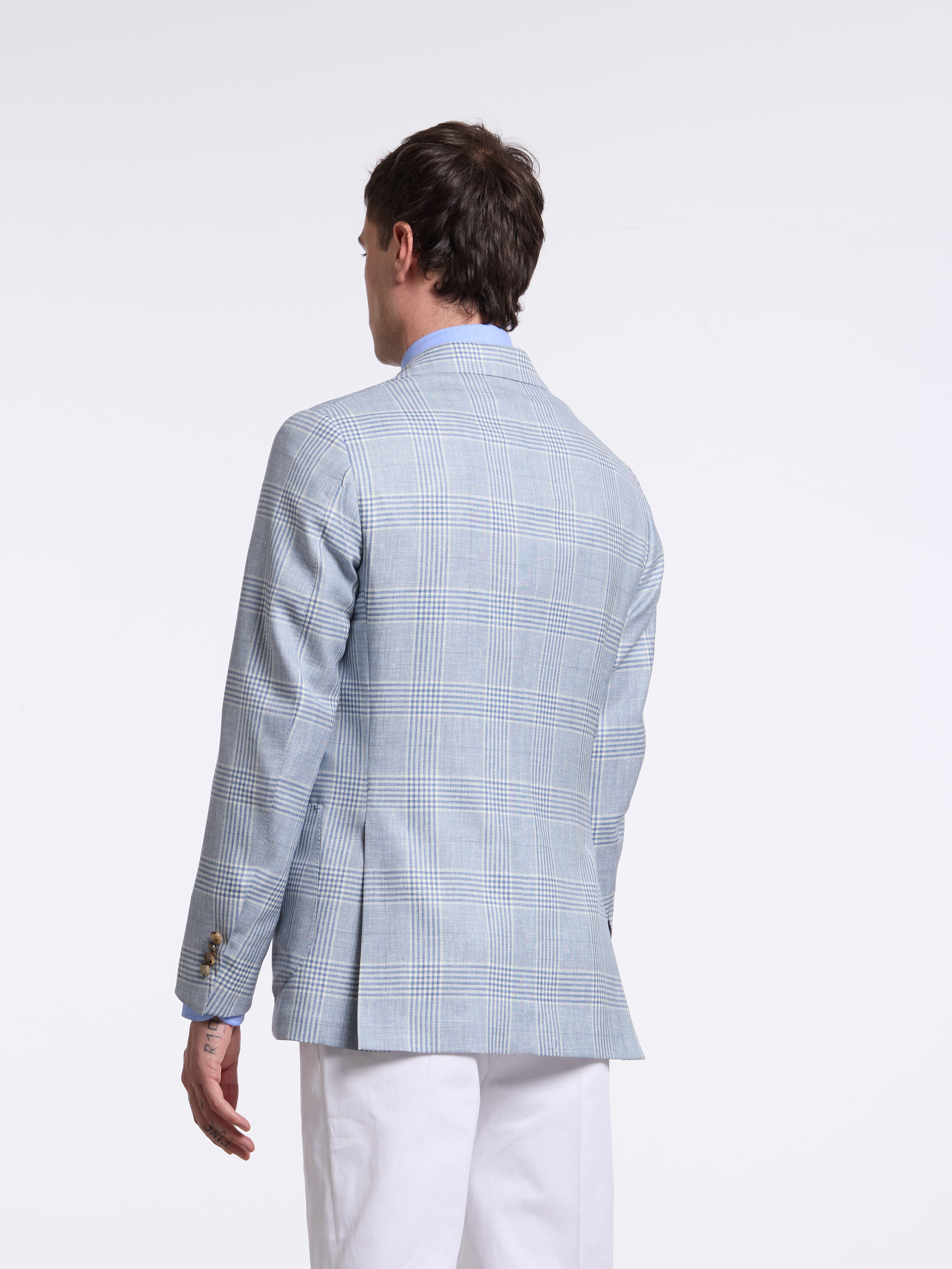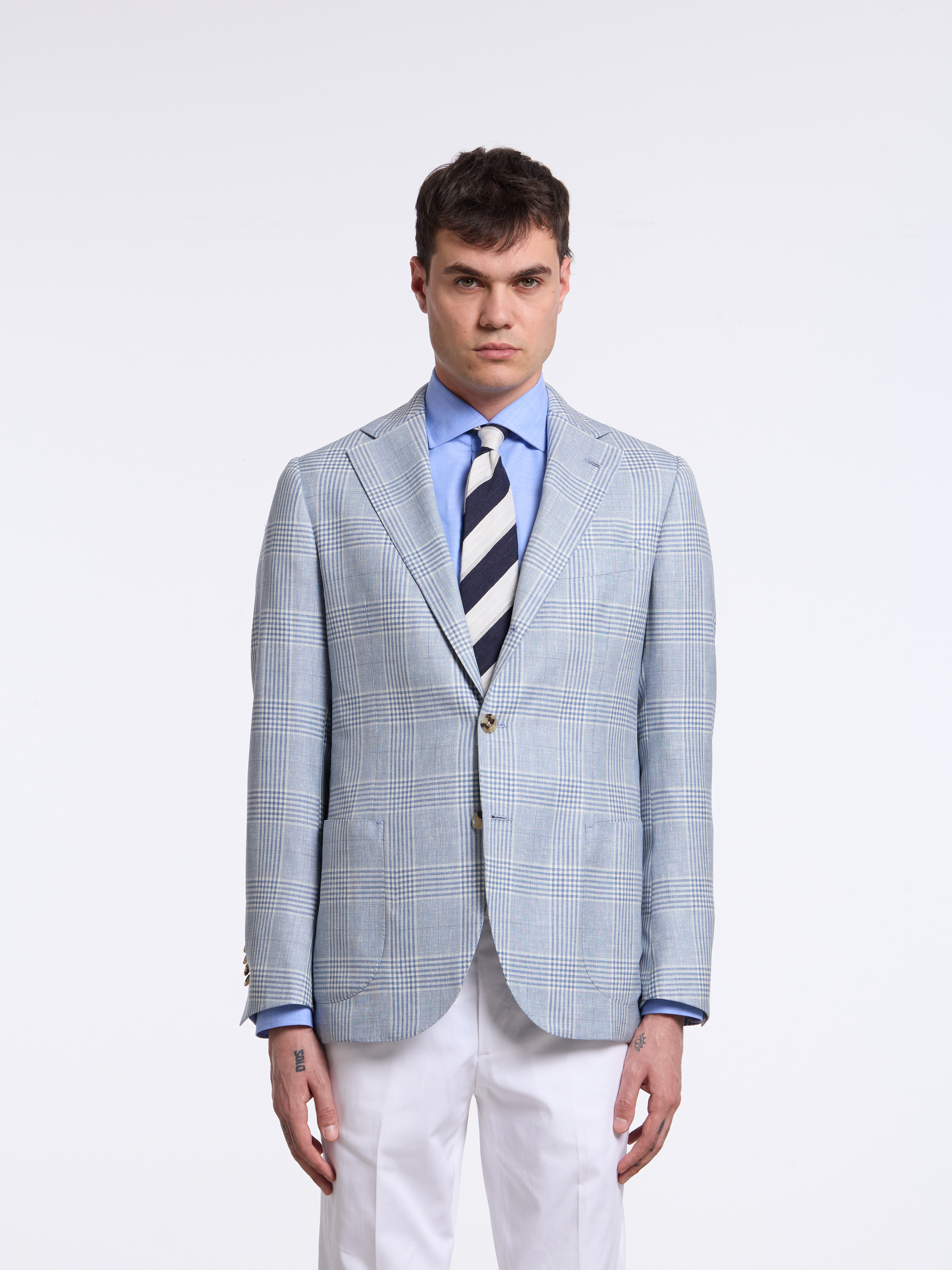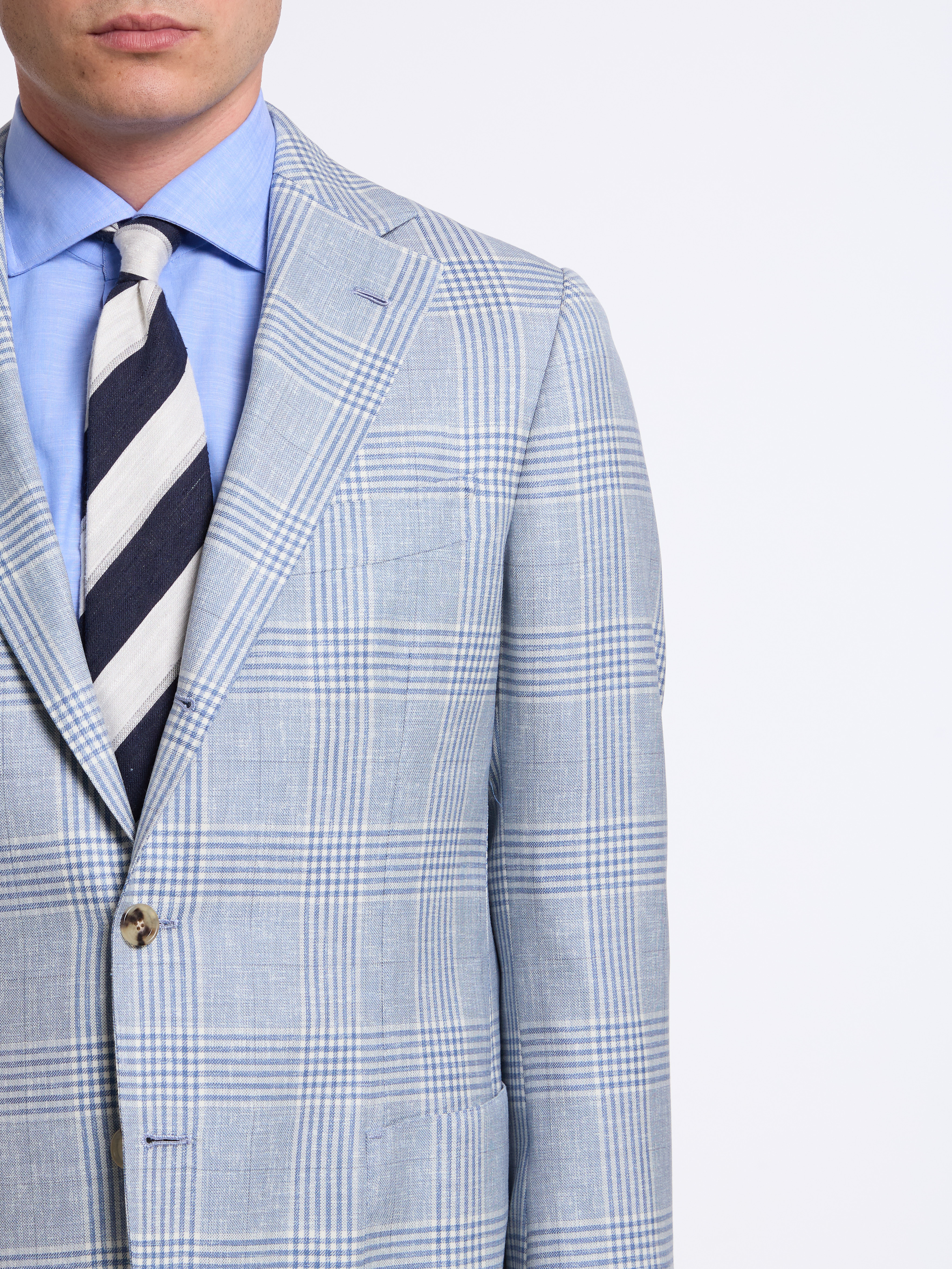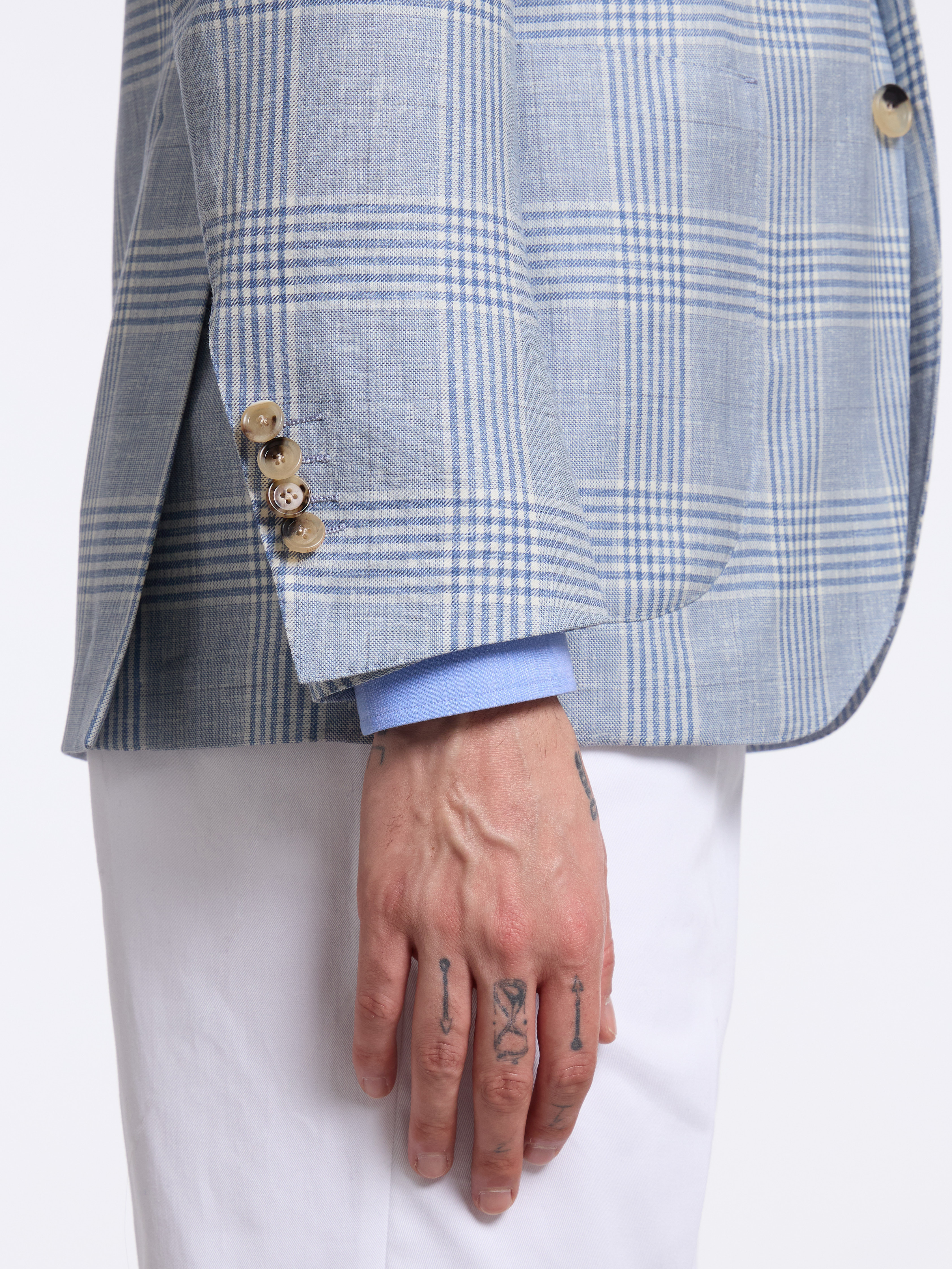 - MODEL: Single-breasted three button pressed to two (unstructured)