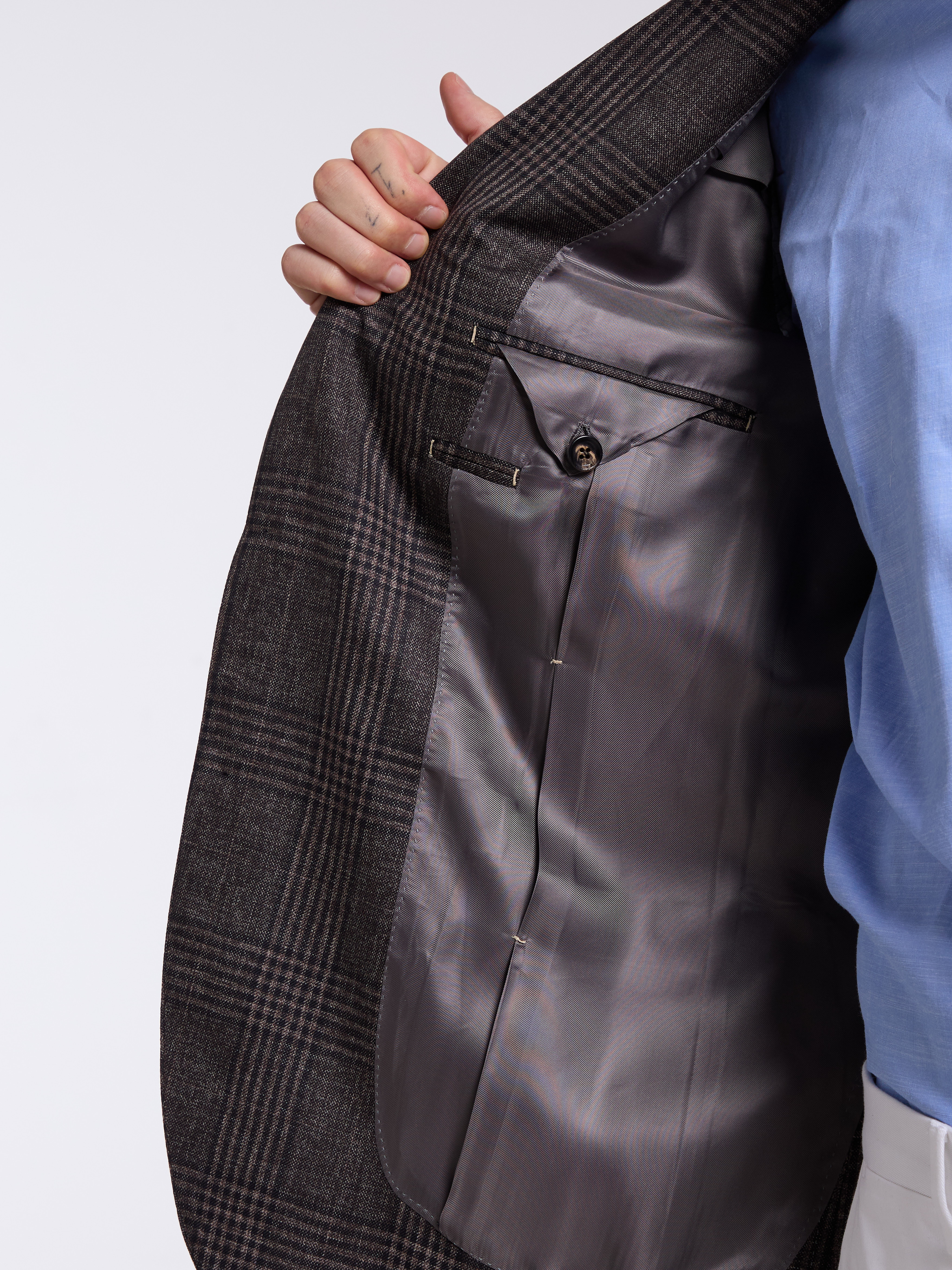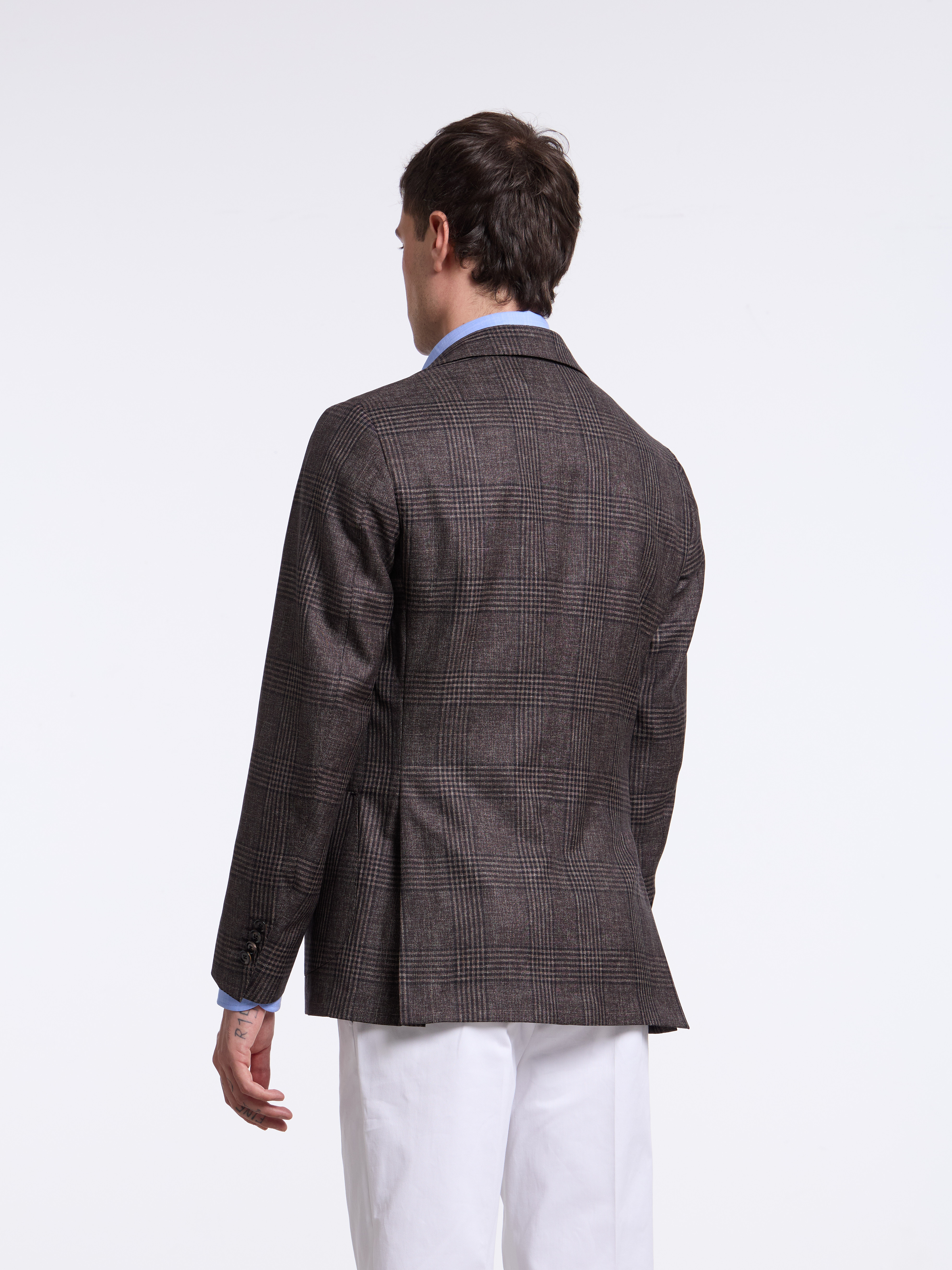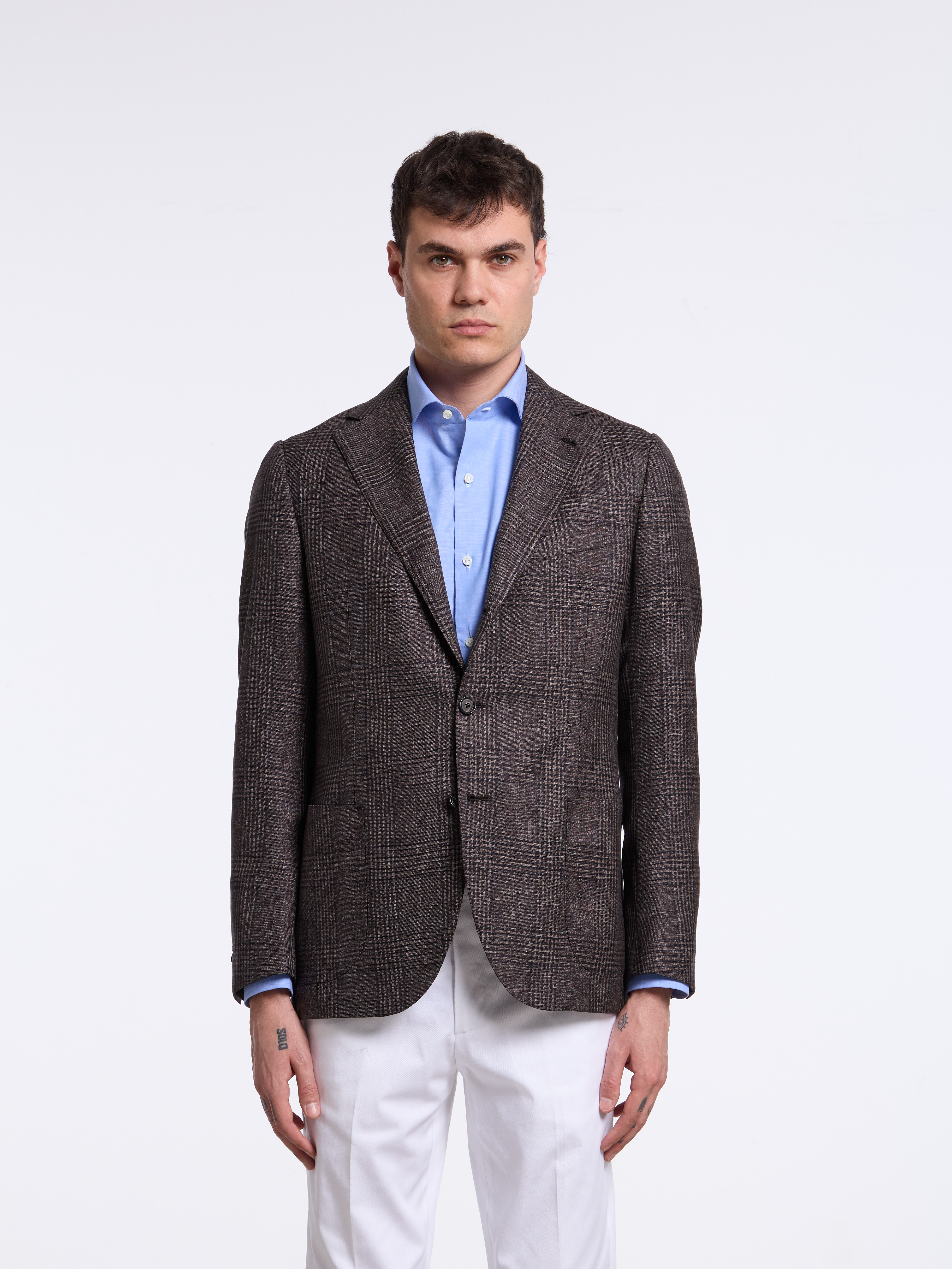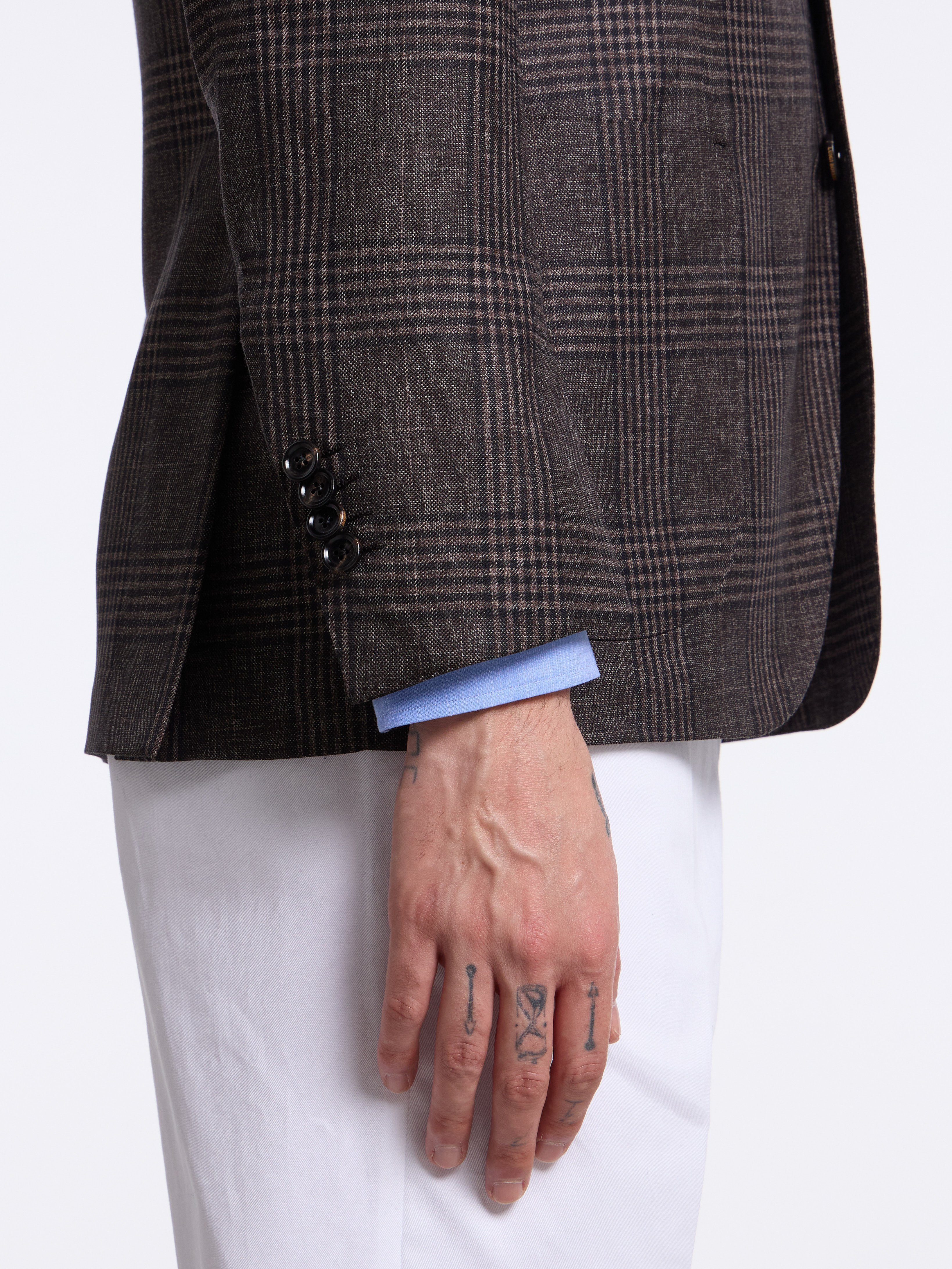 - MODEL: Single-breasted three button pressed to two (unstructured)