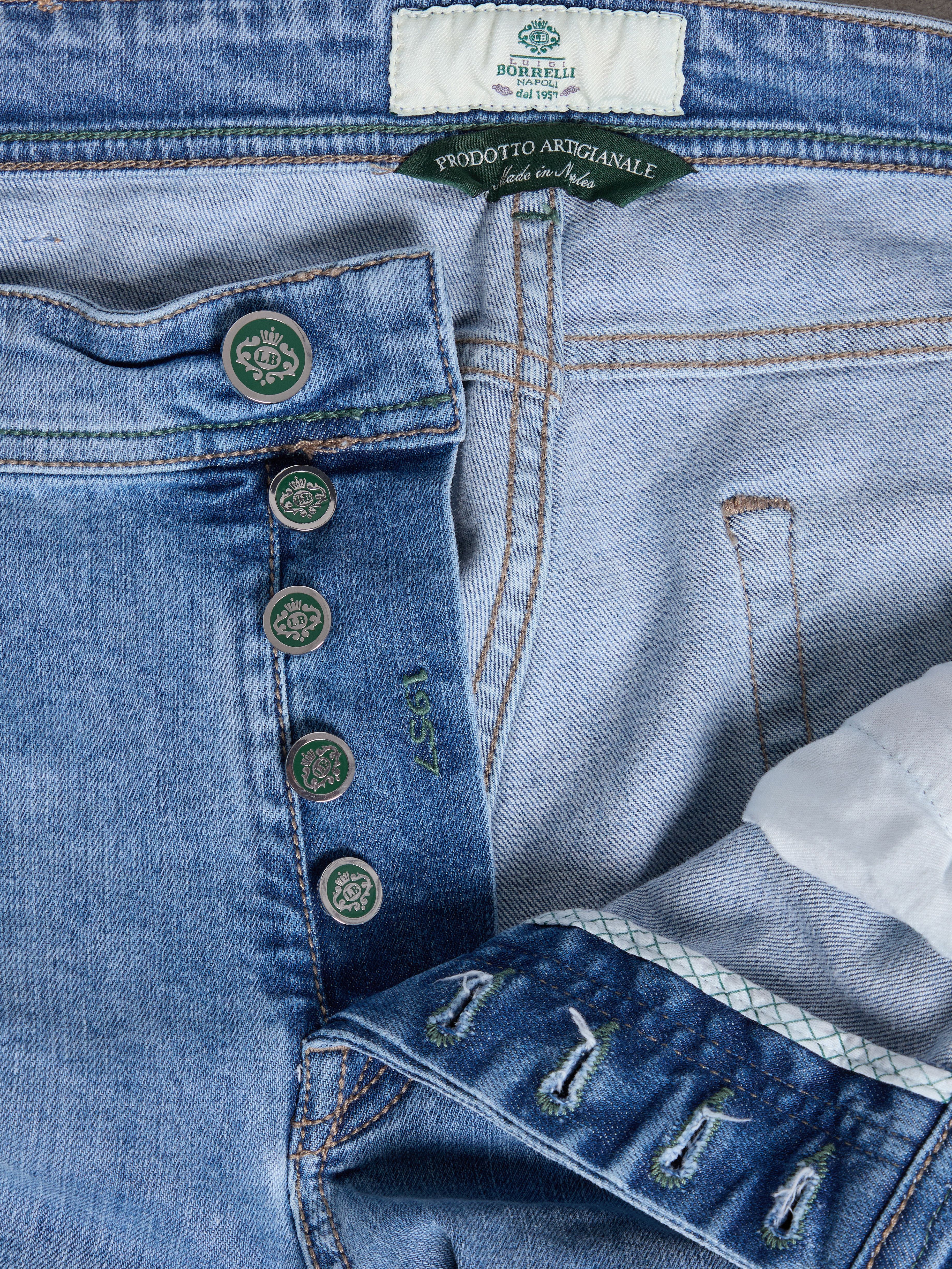 - OTHER DETAILS: Back-logo patch, selvedge bar, inner leg saddle stitch, extra buttons, Made in Italy