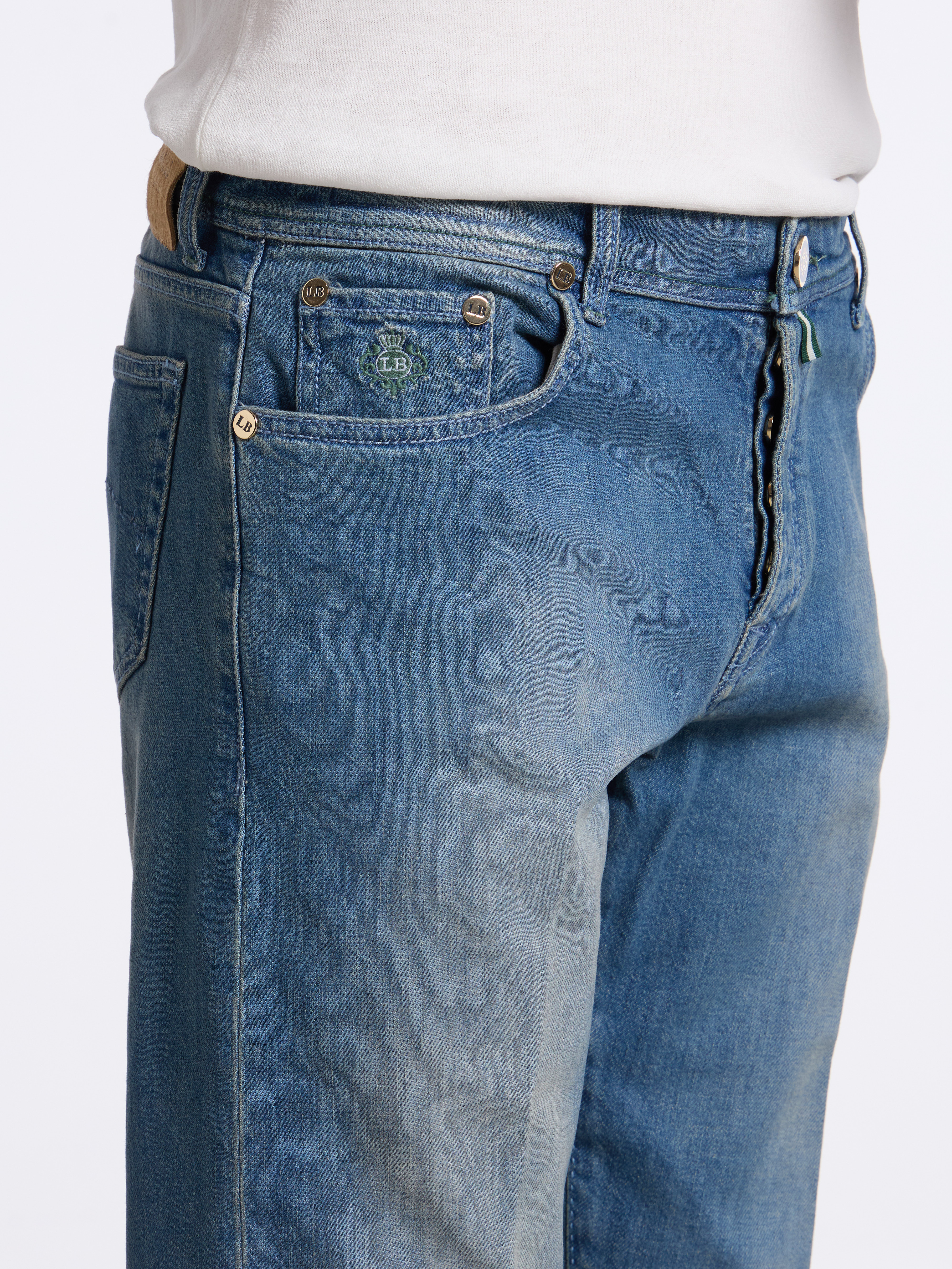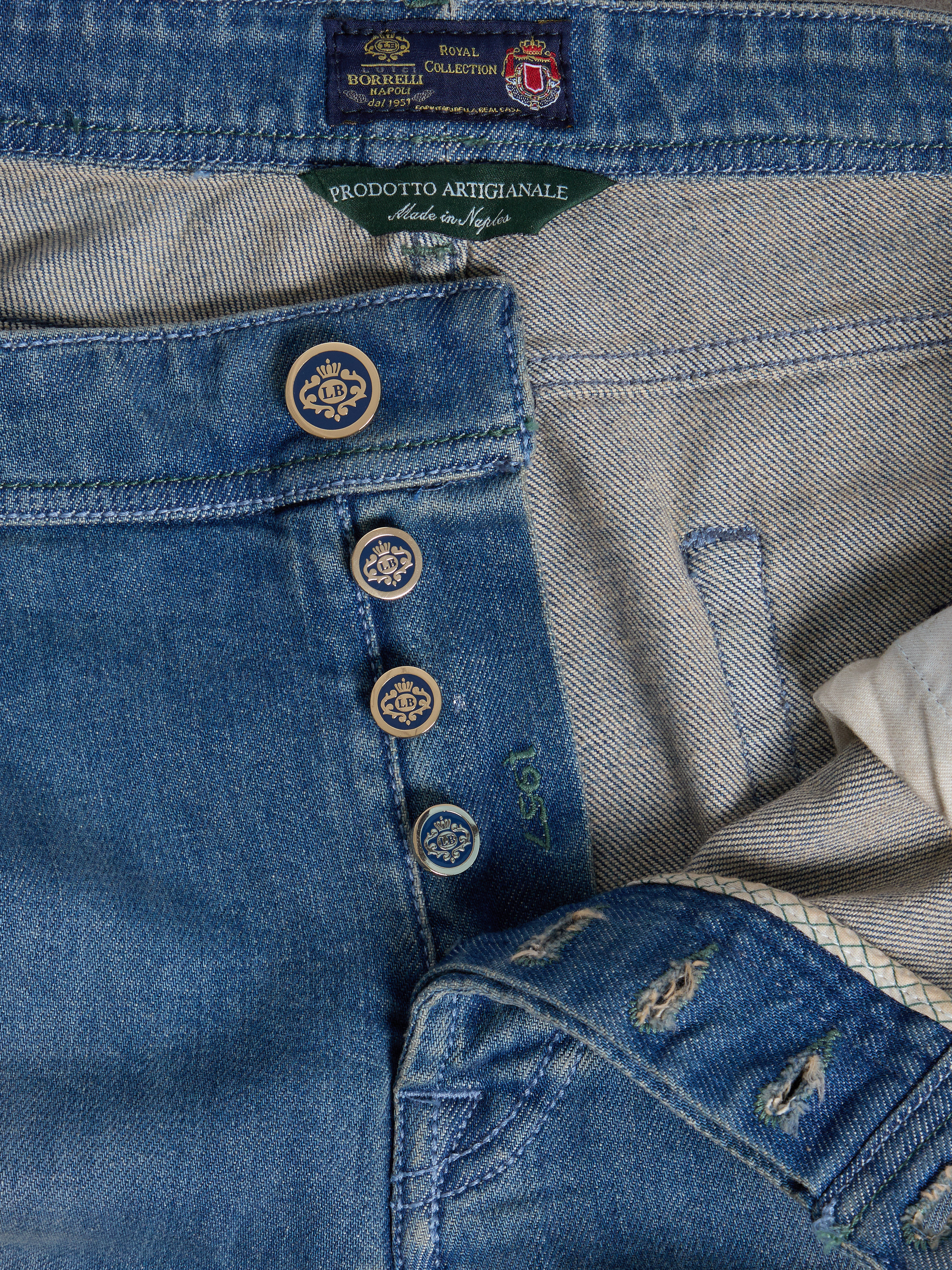 - OTHER DETAILS: Gold-plated buttons and rivets, back-logo patch, selvedge bar, inner leg saddle stitch, extra buttons, Made in Italy